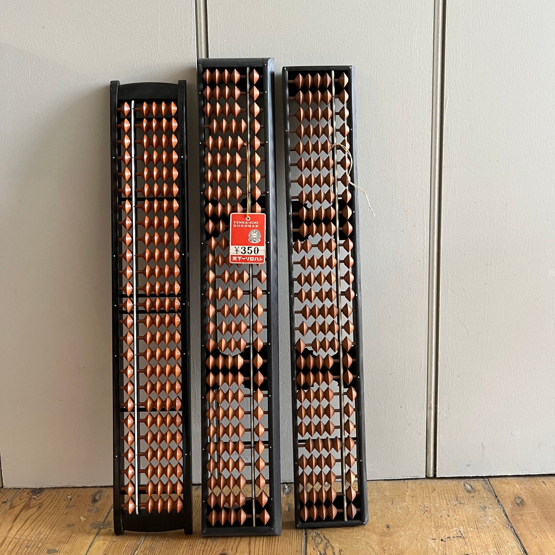 Long Japanese soroban (abacus) once used in markets and schools for counting. In original dead stock packaging, dating from 1960s.