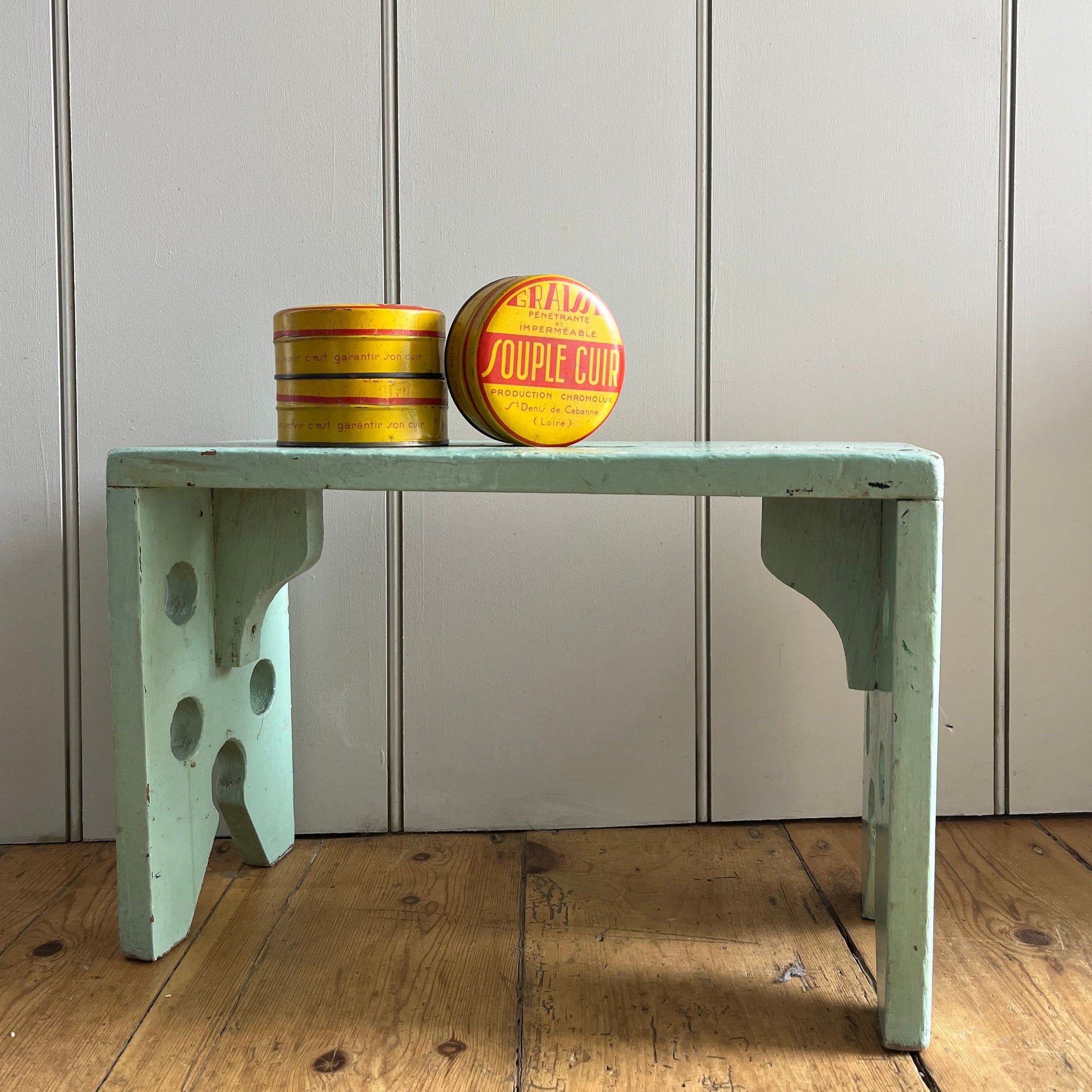 Wonderful yellow and red round metal tins from the Loire from 1930s. Once used for shoe polish, they are a great size and have a striking graphic design.